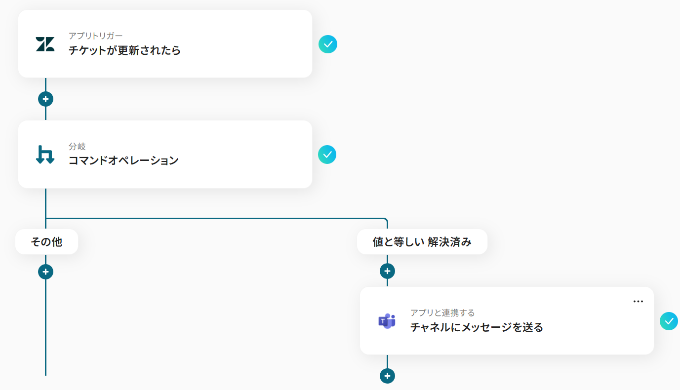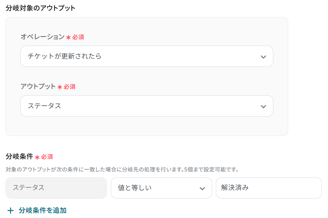 今回は、ステータスが「解決済み」の場合のみフローが進みます。