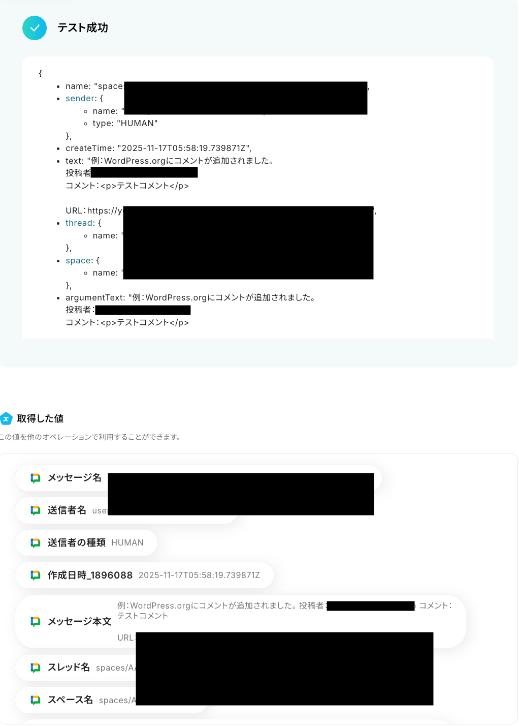 前のステップでWordPress.orgから取得した値を利用して、Google Chatでメッセージを送信しましょう。