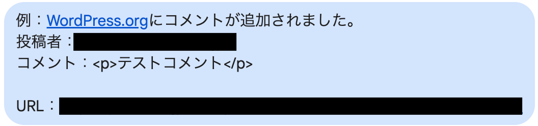 記事名(投稿タイトル)は取得した値には含まれていないため、通知に含められるのはコメント情報および投稿IDまでとなります。