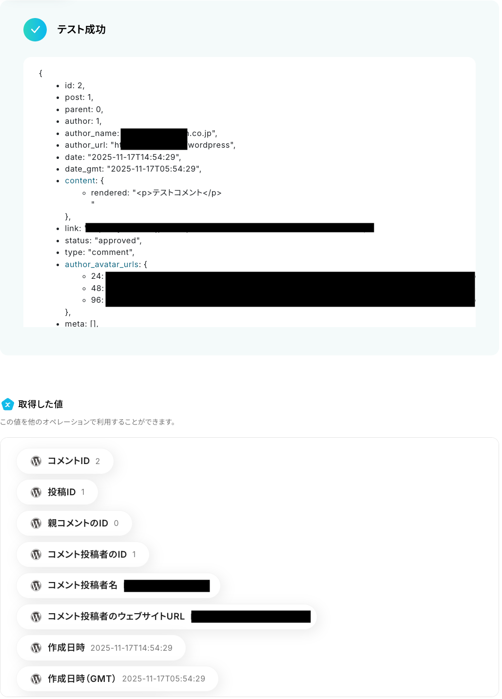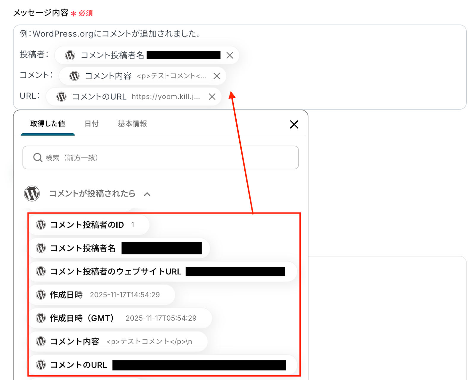通知できる項目は、WordPress.orgの「コメントが追加されたら」アクションでテストを実施した際に表示される、取得した値をご確認ください。
