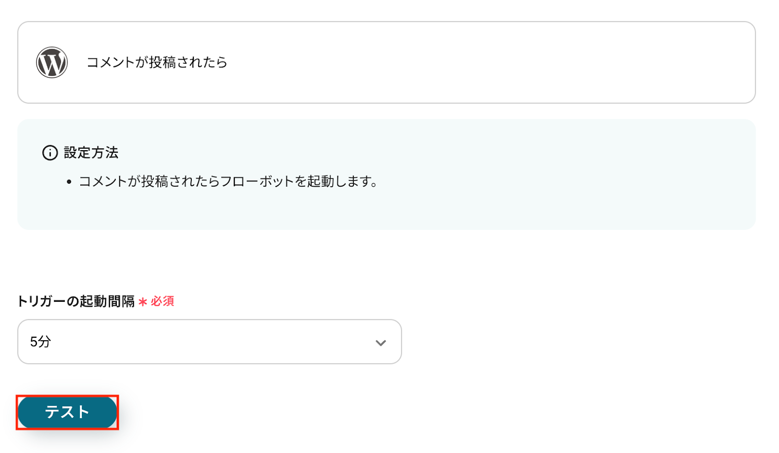 入力が完了したら、設定内容とトリガーの動作を確認するため「テスト」をクリックします。