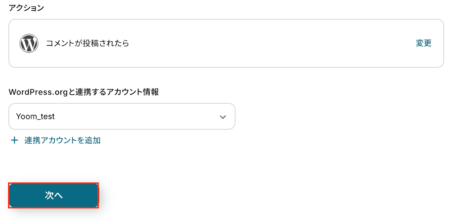 WordPress.orgと連携するアカウント情報に問題がなければ、「次へ」をクリックします。