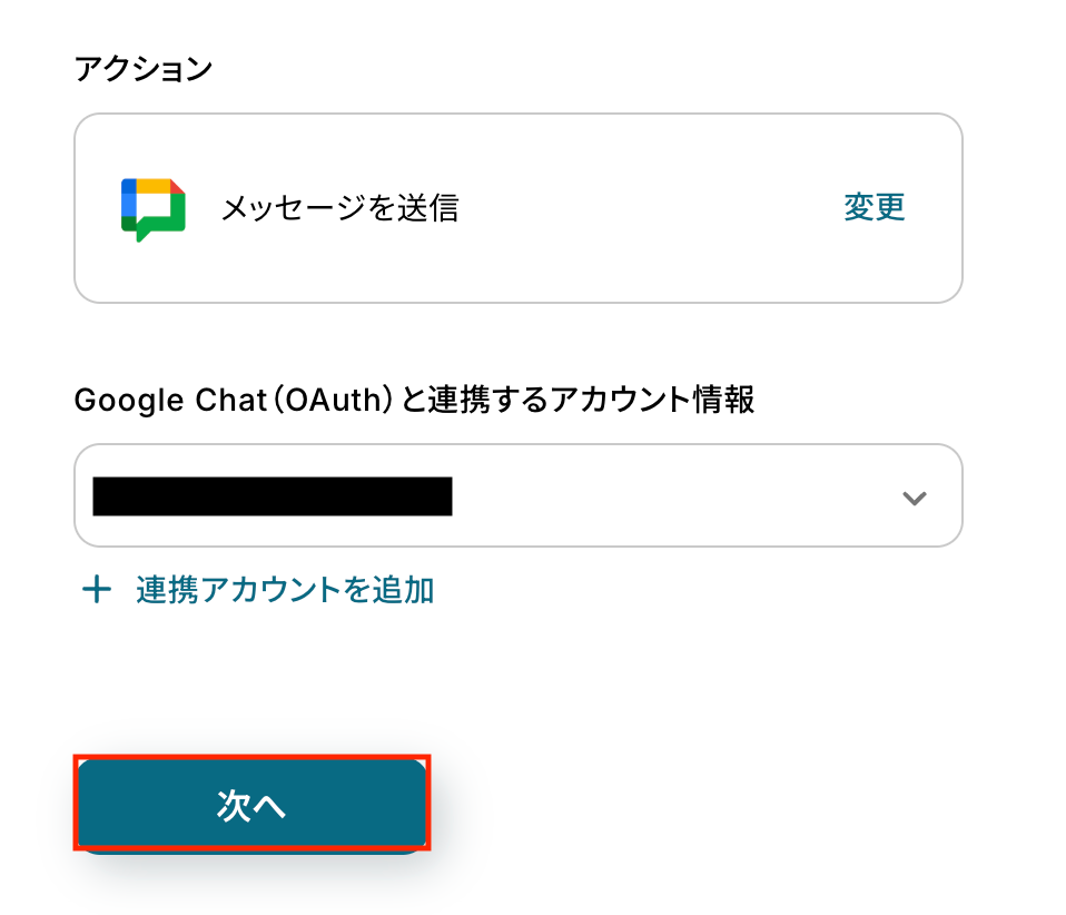 Google Chatと連携するアカウント情報に問題がなければ、「次へ」をクリックします。
