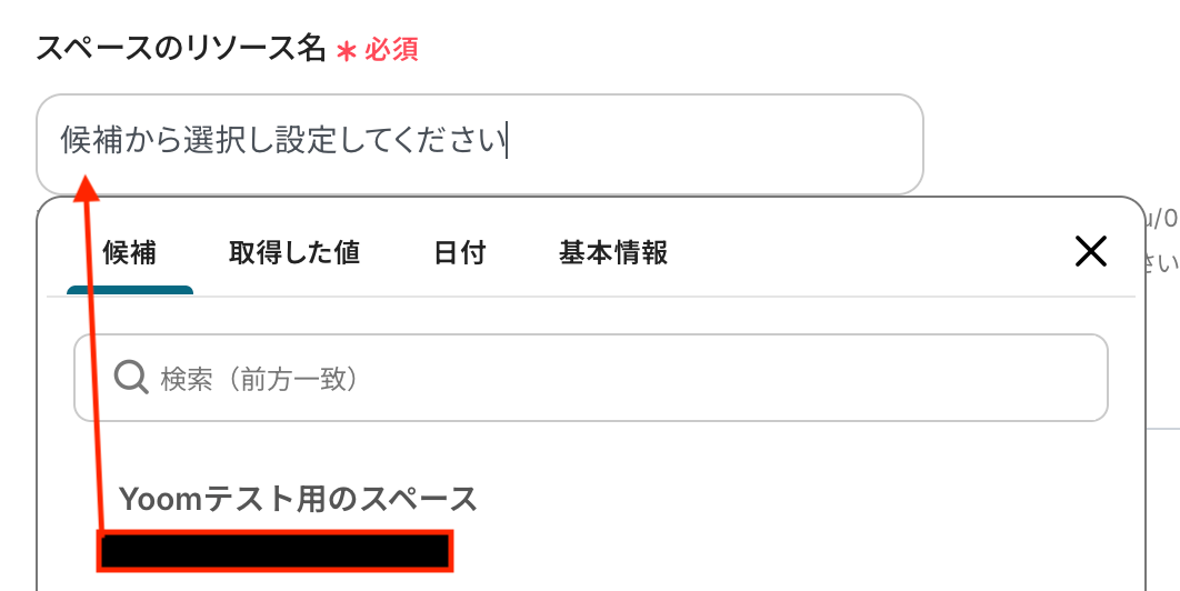 入力欄をクリックするとマイアプリ連携をしたアカウントから候補が表示されるので、対象の項目をそれぞれ選択しましょう。