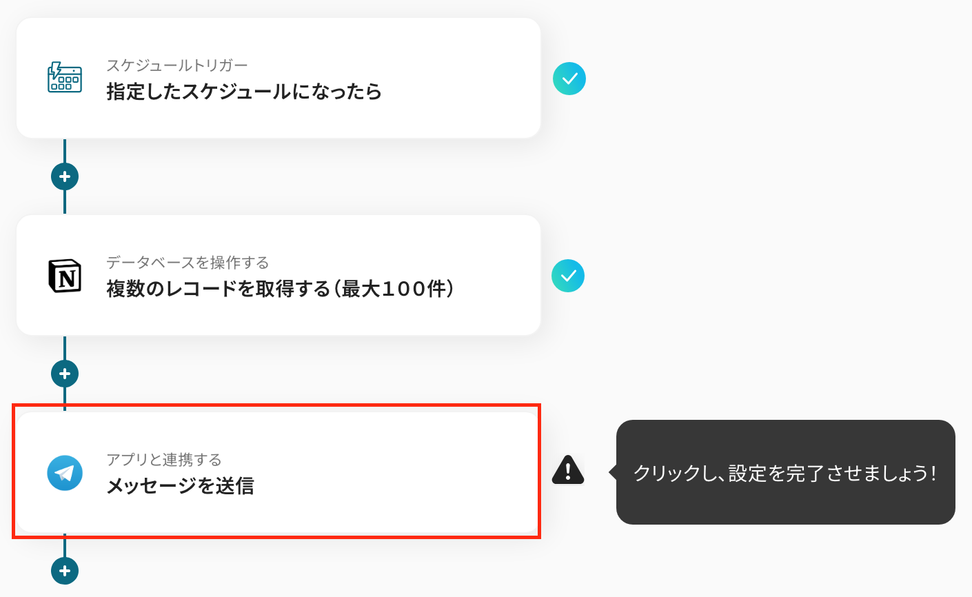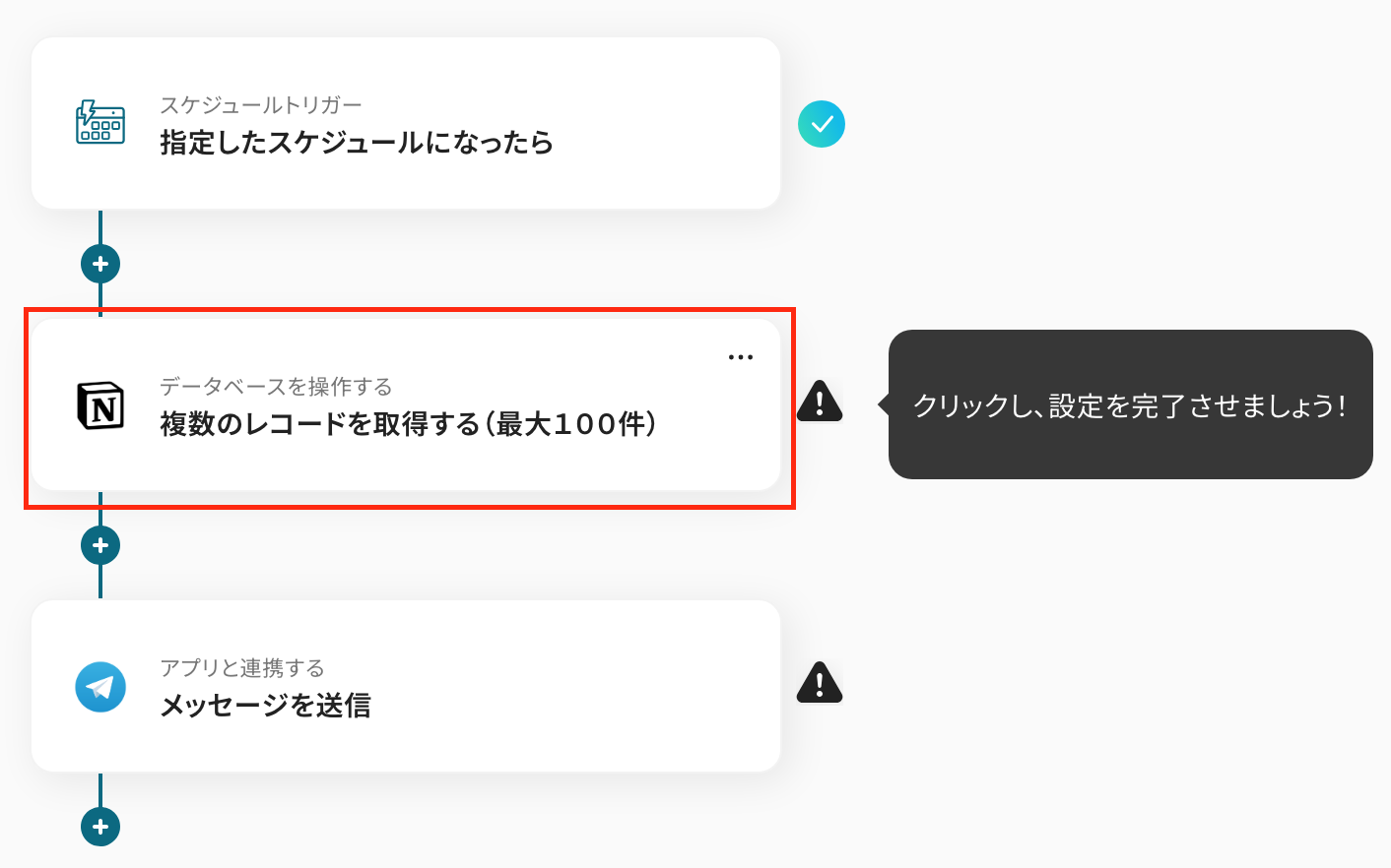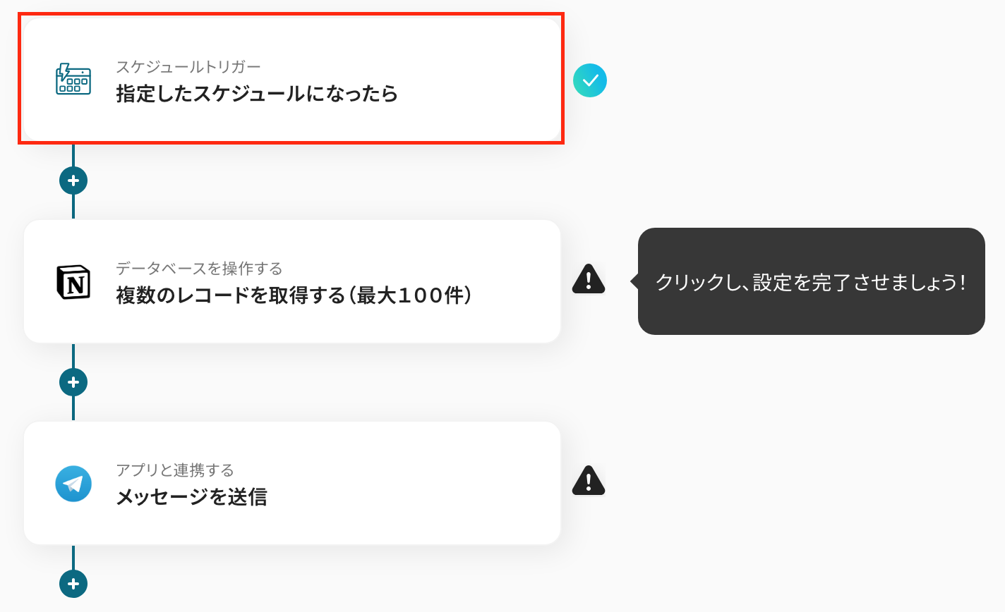 それではここから代表的な例として、毎日Notionデータベース内から本日が期限になっているデータを取得してTelegramに通知するフローを解説していきます!