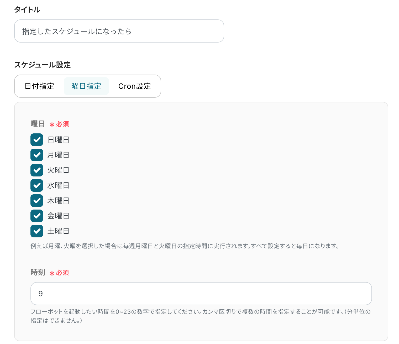 ここでは、毎日Notionデータベース内から今日が期限になっているデータを取得したいので、スケジュール設定では、曜日すべて選択します。時刻は自由に設定してくださいね。タイトルはそのままにして、「保存する」をクリックしましょう!