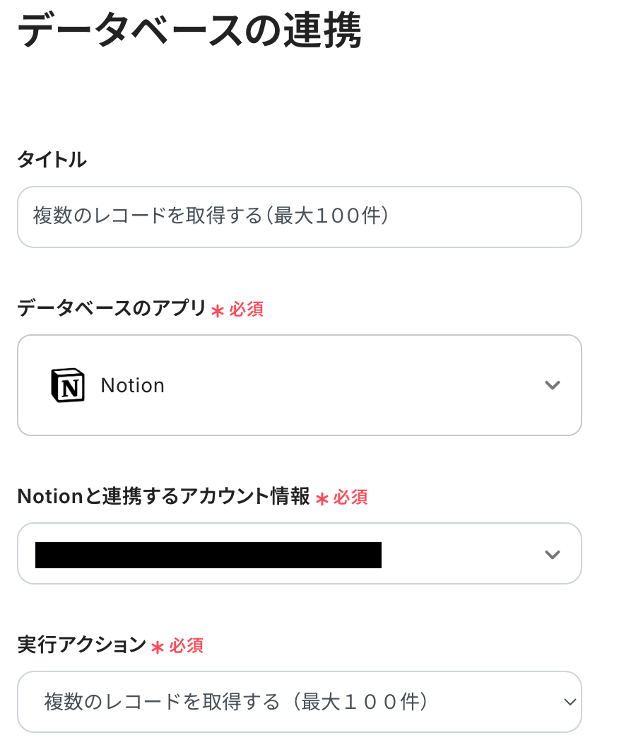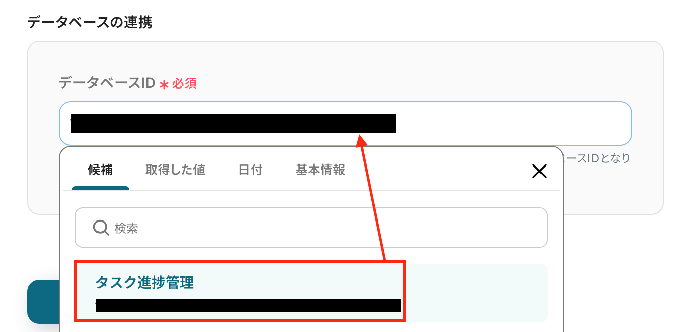 次に、「データベースID」を入力しましょう。以下のように、入力欄をクリックして表示される候補から選択が可能です!