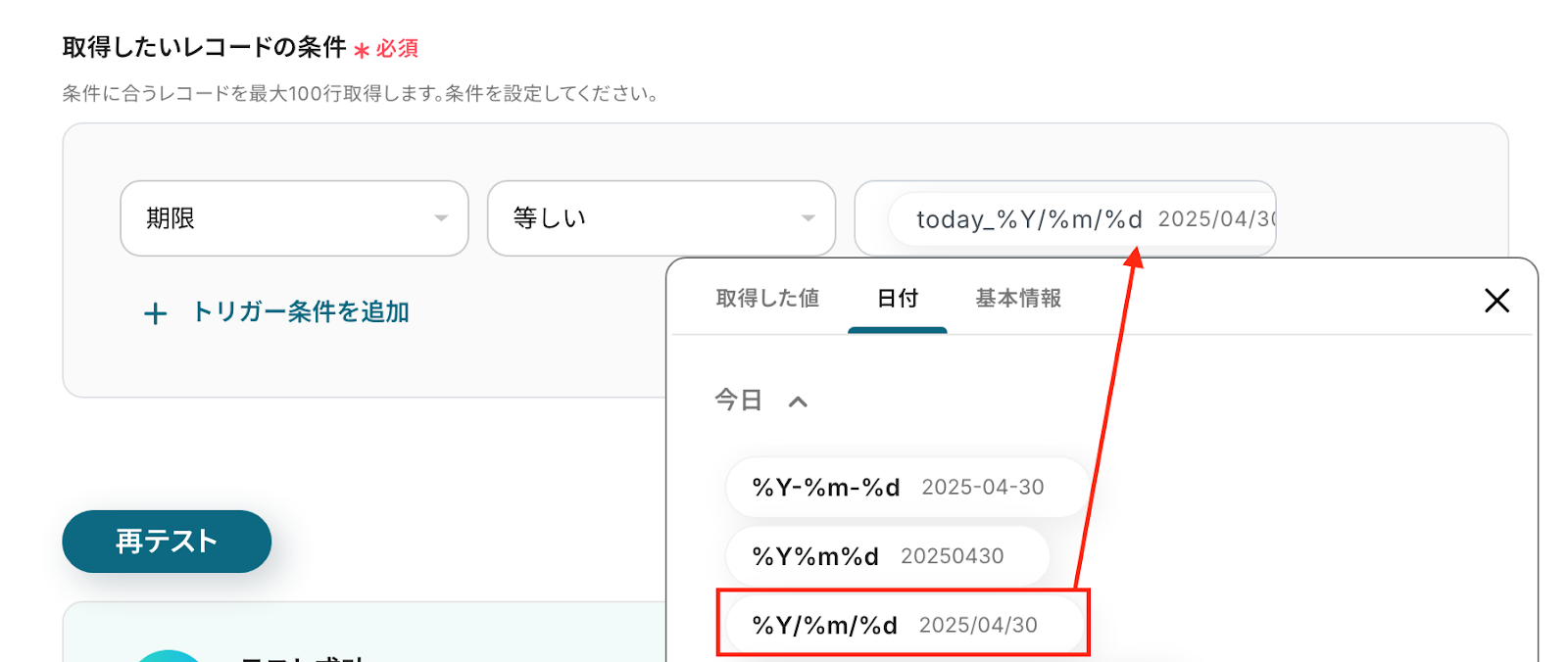 ここでは「取得したいレコードの条件」を設定しましょう!今回は、期限と今日の日付が等しいことを条件に設定します。