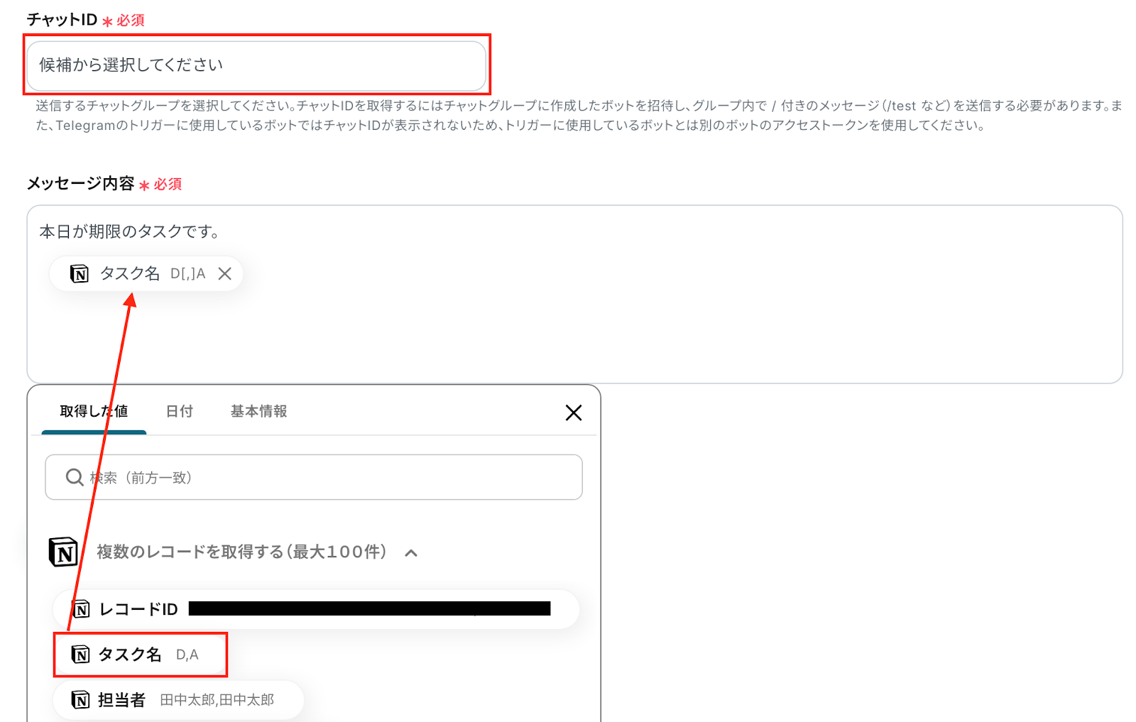 続いて、API接続設定をします。ここでは、チャットIDとメッセージ内容を入力しましょう。