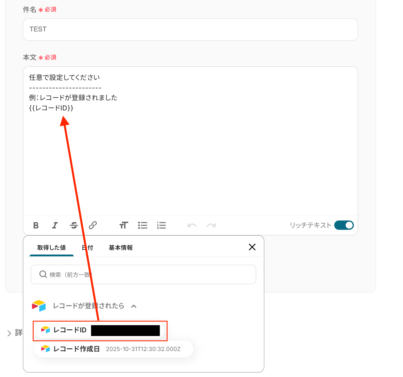 本文にはAirtableから取得した値(例:レコードIDなど)を差し込みデータとして挿入できます。