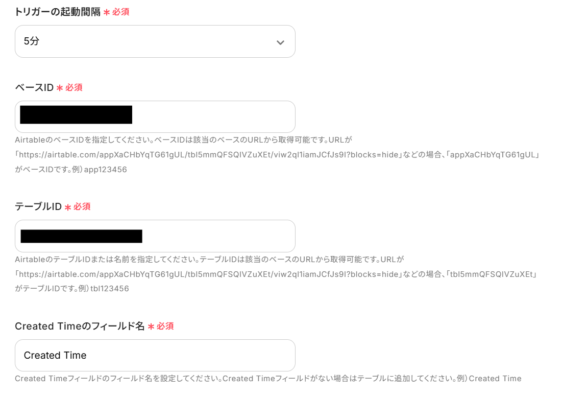トリガーの起動間隔やAirtableのベースID・テーブルIDを入力します。
