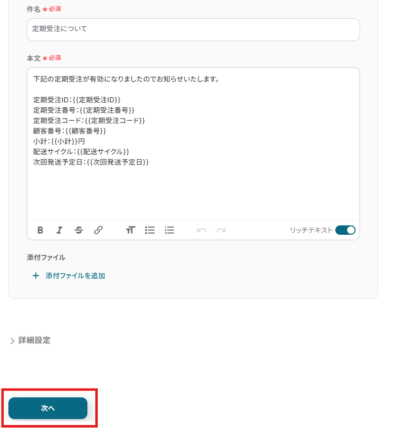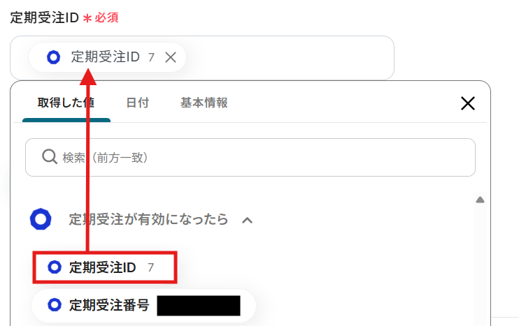 編集欄をクリックして、「定期受注が有効になったら」から「定期受注ID」を選択してください。
