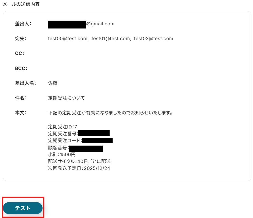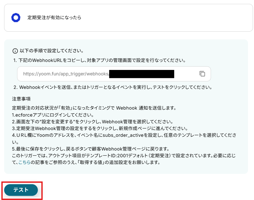 テスト用の定期受注を作成したら、Yoomの操作画面に戻り、「テスト」をクリックします。