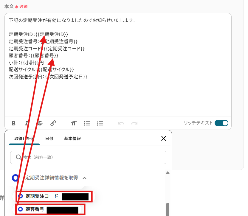 これにより、毎回変動する情報を手動で入力する必要がなくなり、効率的に連携できます!