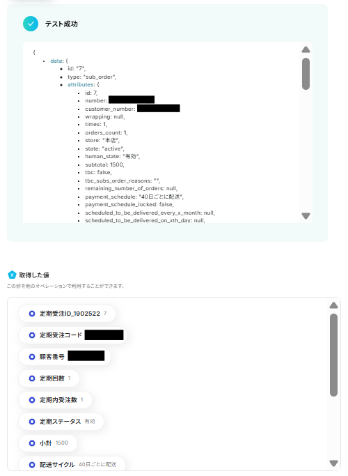 テストが成功すると取得した値の横に、ecforceで作成した定期受注の基本情報が表示されます。