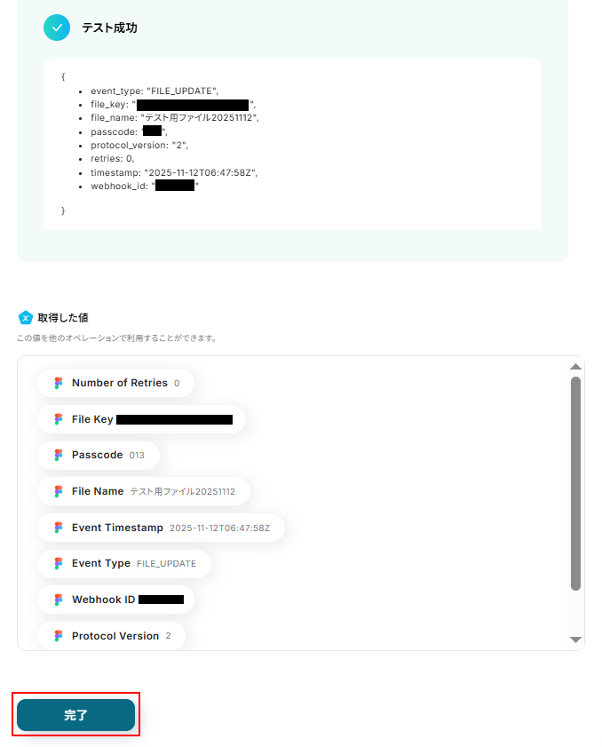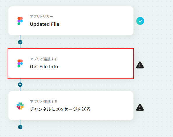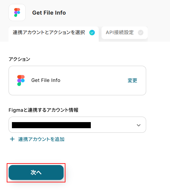 - 続けて、オペレーションでFigmaの「ファイル情報を取得する」アクションを設定し、更新されたファイルの詳細情報を取得します