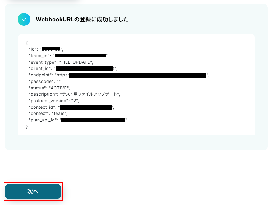 登録に成功すると、WebhookURLの登録に成功しましたと表示されます。