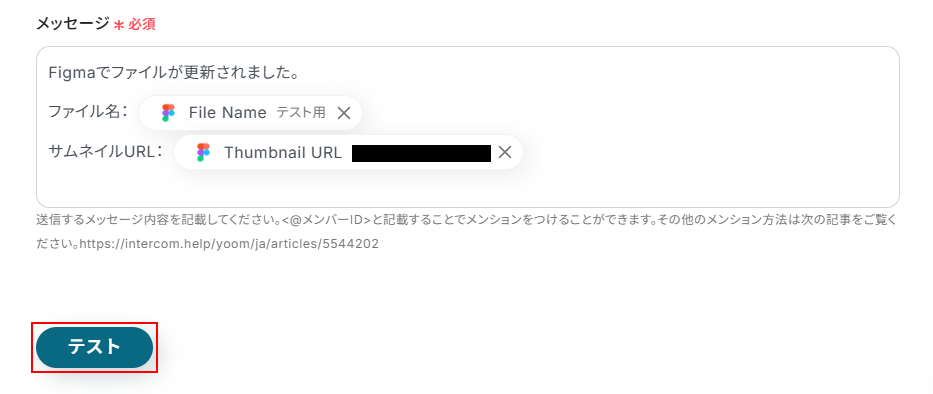 - 通知するメッセージの本文は、固定のテキストを設定するだけでなく、トリガーで取得したFigmaのコメント内容や投稿者名などの情報を変数として埋め込み、自由にカスタマイズできます