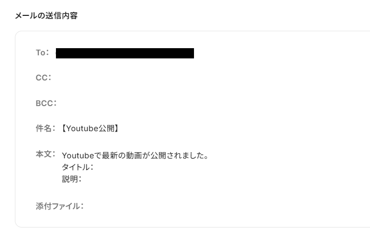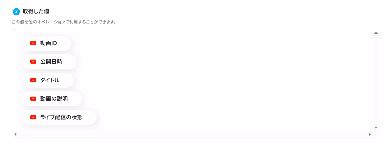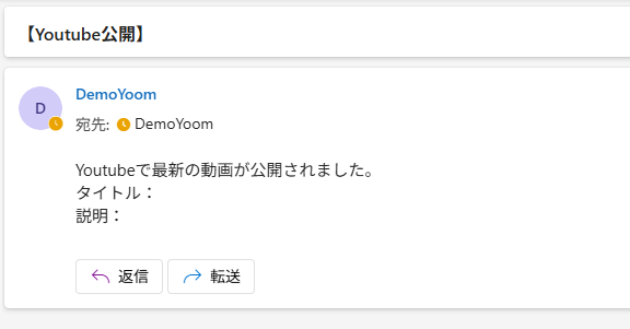 ※今回は、YouTubeのアウトプット(取得した値)が空白のため、本文の「タイトル」や「説明」が表示されていません。