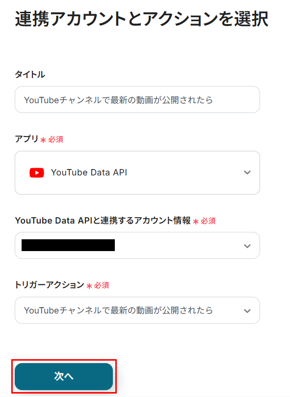 2.タイトルと連携するアカウント情報を任意で設定し、アクションはテンプレート通りのまま「次へ」をクリックして進んでください。