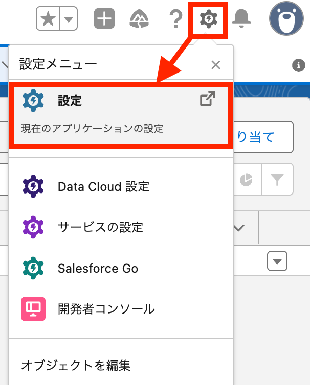 マイドメインURLを確認するには、Salesforceにログインし、画面右上の歯車アイコンをクリックして設定を開きます。