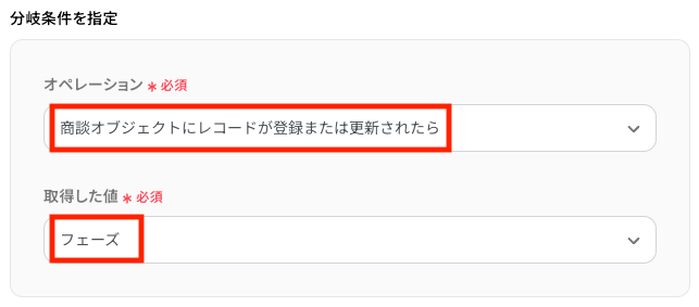 今回は、商談がメール送信対象のステータス(フェーズ)かどうかを判定するため、ステップ1で取得したフェーズを分岐の判断対象に指定します。