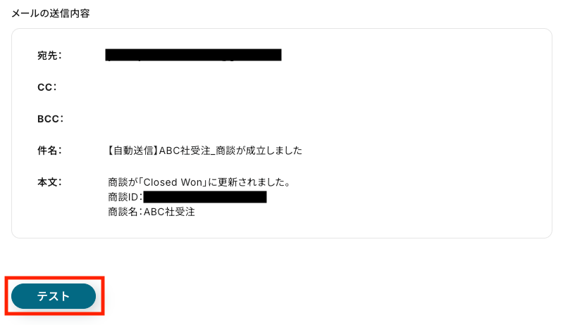 今回の例では、商談が成立したときのみメールを送信するため、以下のように設定します。