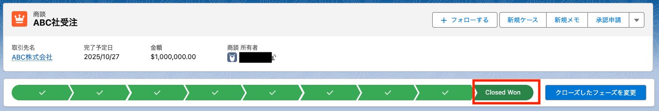 今回は標準オブジェクトの「商談」で、ステータスが「Closed Won(成約)」のレコードを追加しました。