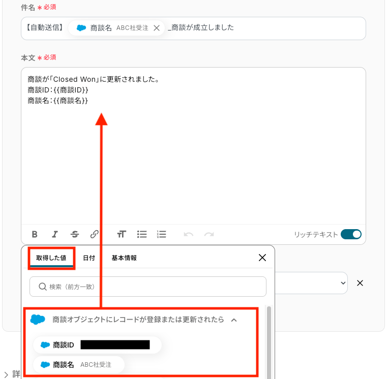 また、Salesforceから取得した商談名や金額などの動的な値を使うことも可能です。