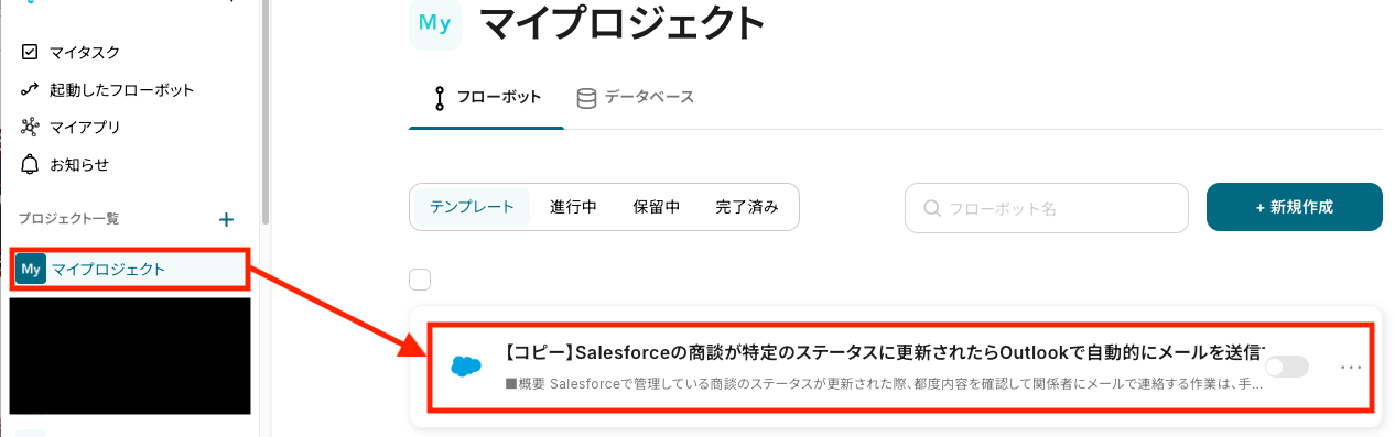マイプロジェクトから、「【コピー】Salesforceの商談が特定のステータスに更新されたらOutlookで自動的にメールを送信する」を選んでください。