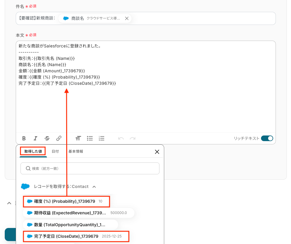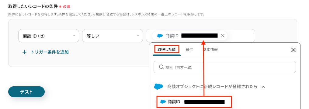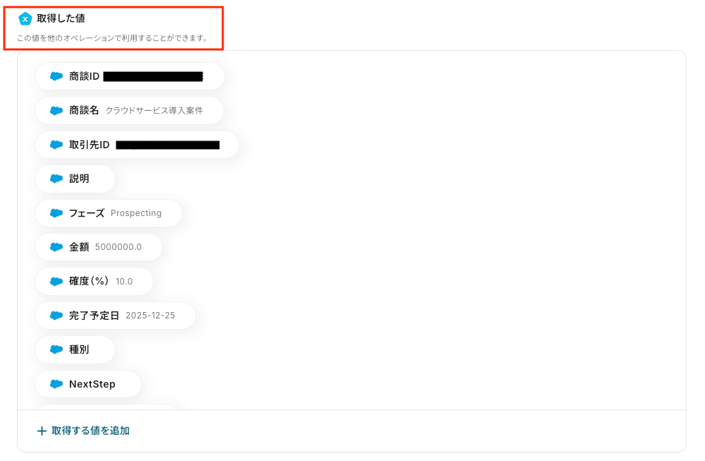 「取得したいレコードの条件」(この記事では「商談」)を、取得した値から選択します。