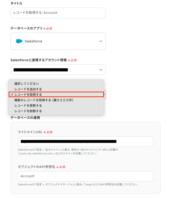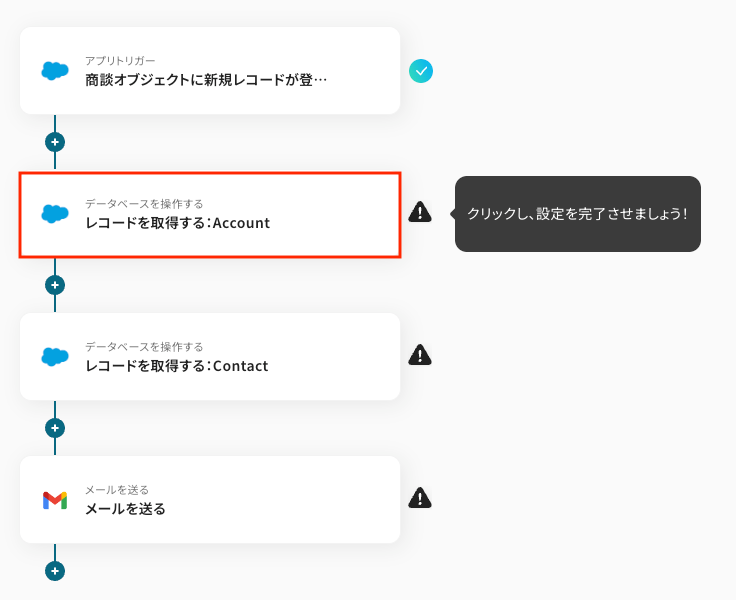 二つ目のオペレーションにある、「レコードを取得する:Account」をクリックしてください。