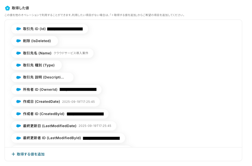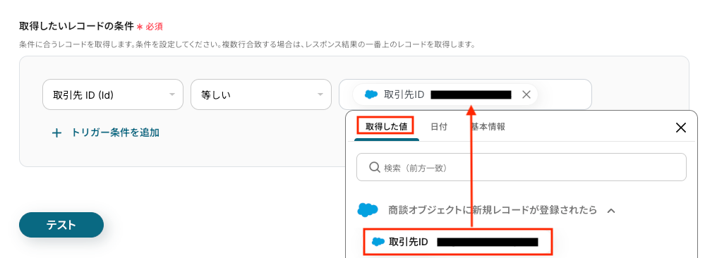 「取得したいレコードの条件」(この記事では「取引先」)を、取得した値から選択します。