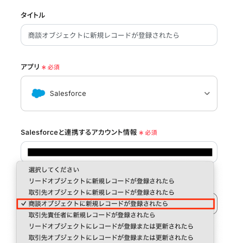 - トリガーアクション:「商談オブジェクトに新規レコードが登録されたら」を選択