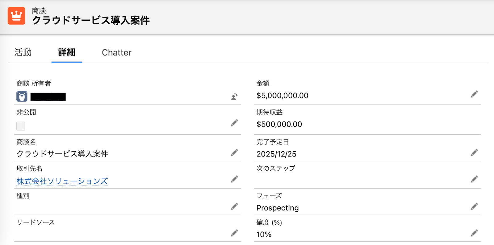 - テストを行う際は、トリガーとなるレコードが必要です。以下のように、Salesforceで商談を登録してみてください。