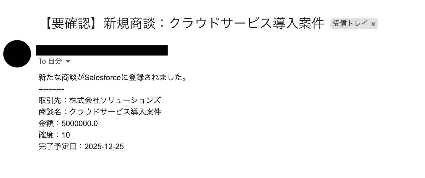 もし、Salesforceで商談が登録された際、関係者へ自動でメール通知される仕組みがあれば、より迅速な顧客対応や営業活動に集中できる時間を生み出せます。