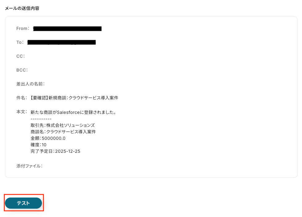 「メールの送信内容」を確認し、「テスト」をクリックしてください。