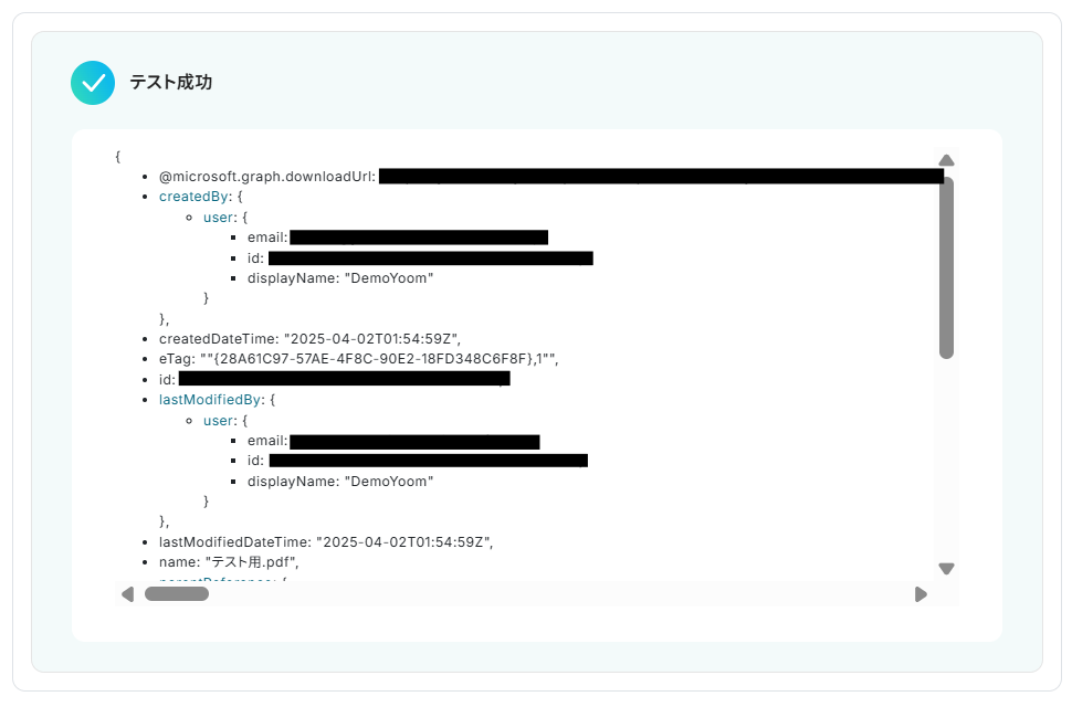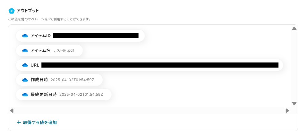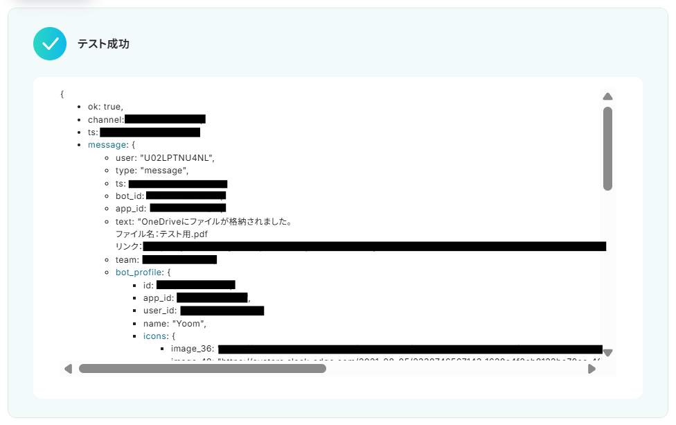 以下のアウトプットをこの後の設定時に引用することで、OneDriveとSlackのデータ連携を実現していきます!