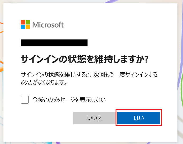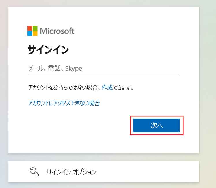以下の画面が出てきたら、Microsoftのアカウントにログインします。