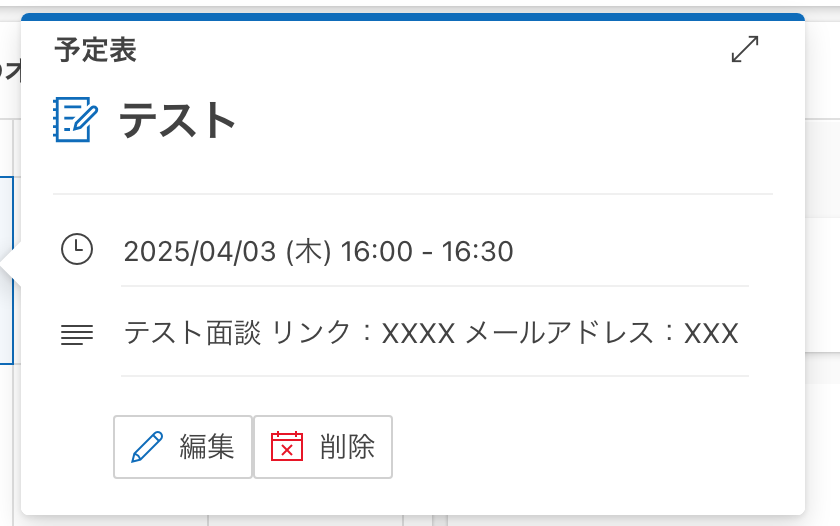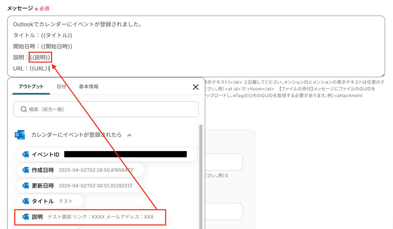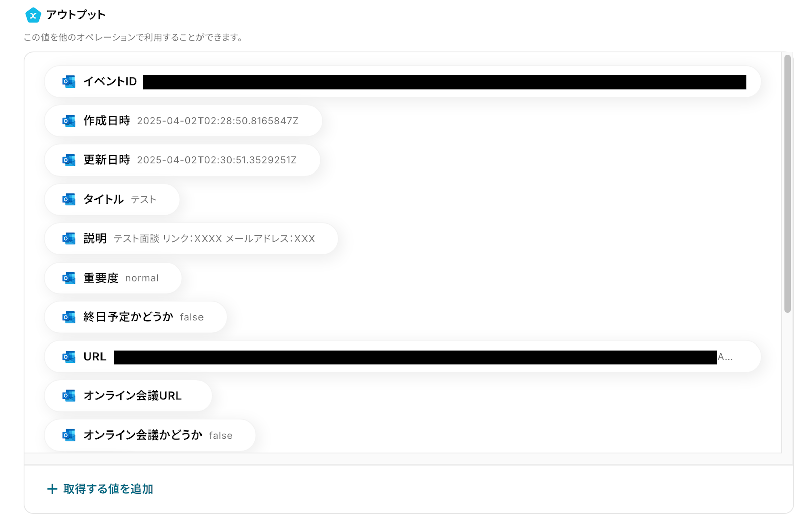 入力後、「テスト」をクリックするとOutlookで設定したカレンダーの内容がアウトプットとして取得できます。