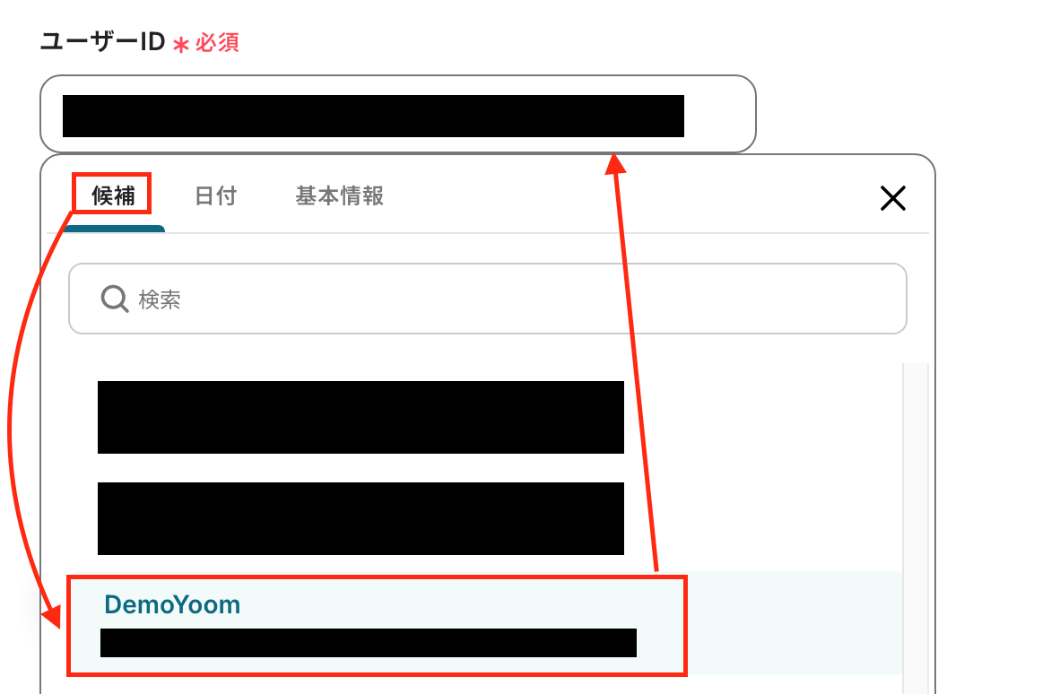 - ユーザーID:入力欄をクリックして表示される候補より選択します。