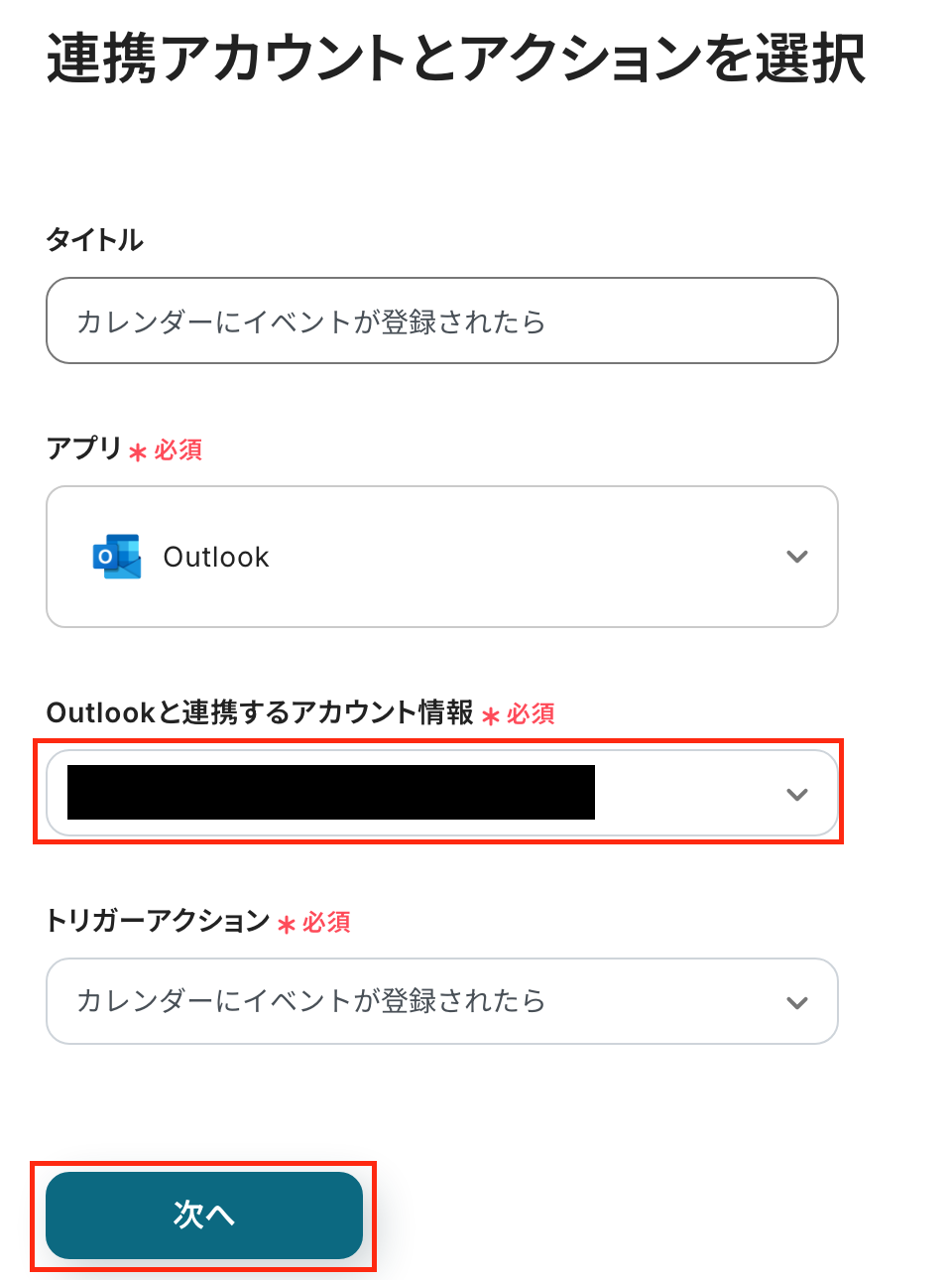 先ほどと同様に連携するアカウント情報が間違っていないか確認し、「次へ」をクリックします。