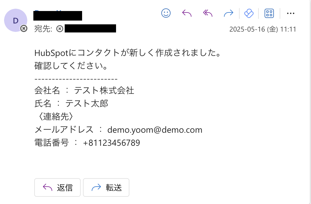 HubSpotのコンタクト情報が反映された状態で、設定したメッセージの通りにメールが届いていました!