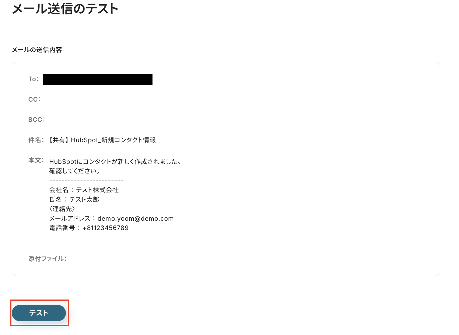 コンタクトを作成したら、Yoomの画面に戻って「テスト」をクリックします。