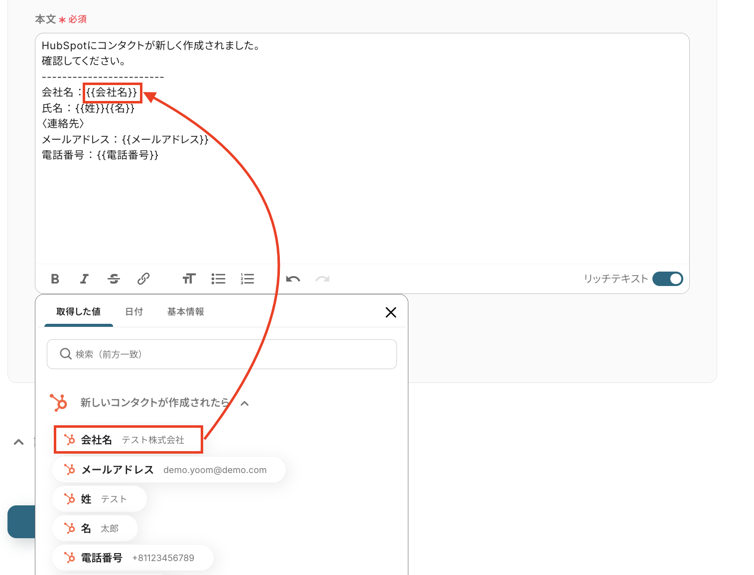 「HubSpotにコンタクトが新しく作成されました。」など、定型的な文章は直接手入力し「会社名」や「氏名」など、HubSpotの情報を引用したい部分はアウトプットを用いて設定しましょう!