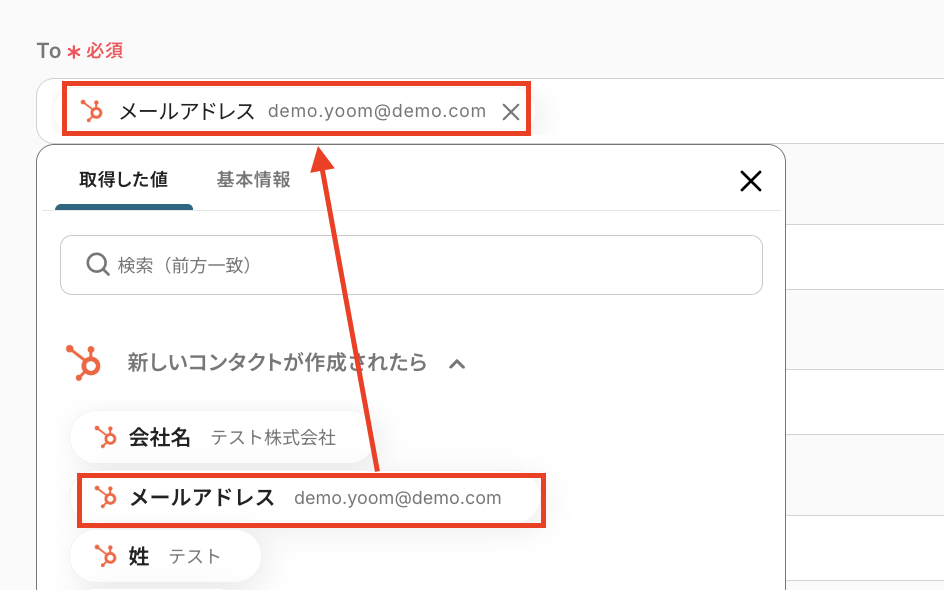 テストが成功すると、「取得した値」に先ほど作成したコンタクト情報がアウトプットとして抽出されるので、内容を確認しましょう!
