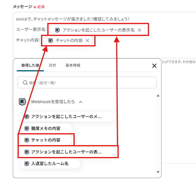 「メッセージ」は、入力欄をクリックして表示されるアウトプット(取得した値)から選択できます。