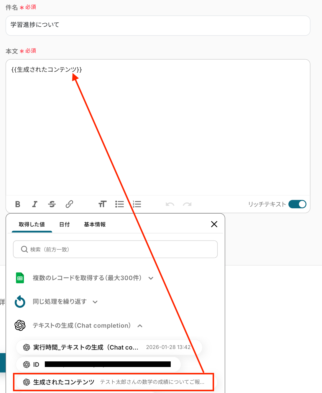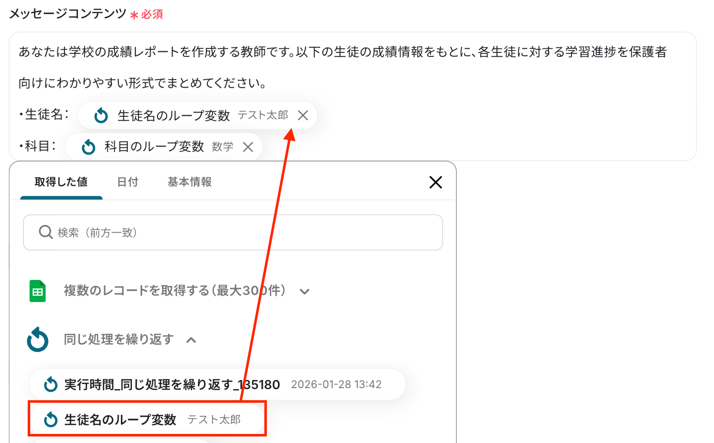 「取得した値」は、下記画像のように、先ほどのステップで取得した値を設定します。