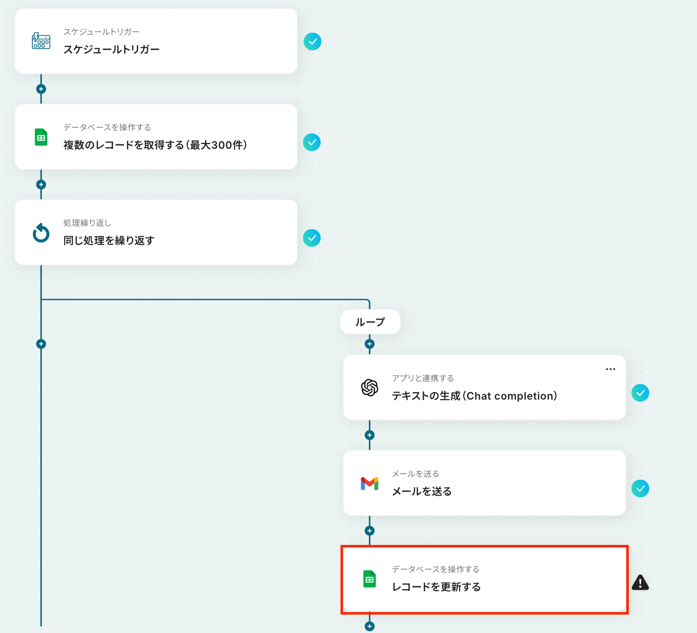 それではここから代表的な例として、定期的にGoogle スプレッドシートから学習進捗データを取得し、その内容をOpenAIで要約した上で、保護者宛にGmailで自動通知するフローを解説していきます!