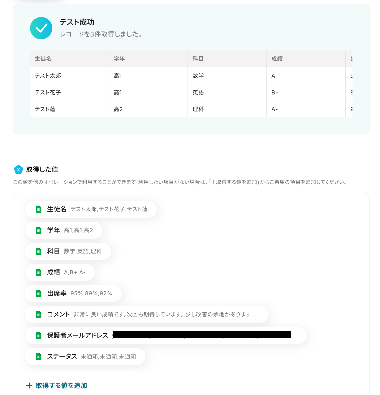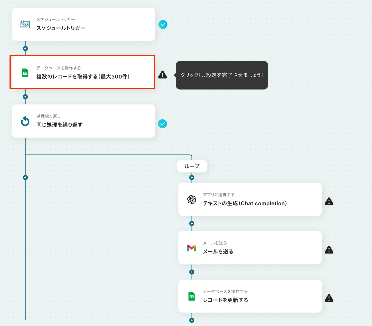 ここでは、Google スプレッドシートで複数のレコードを取得する設定を行います。